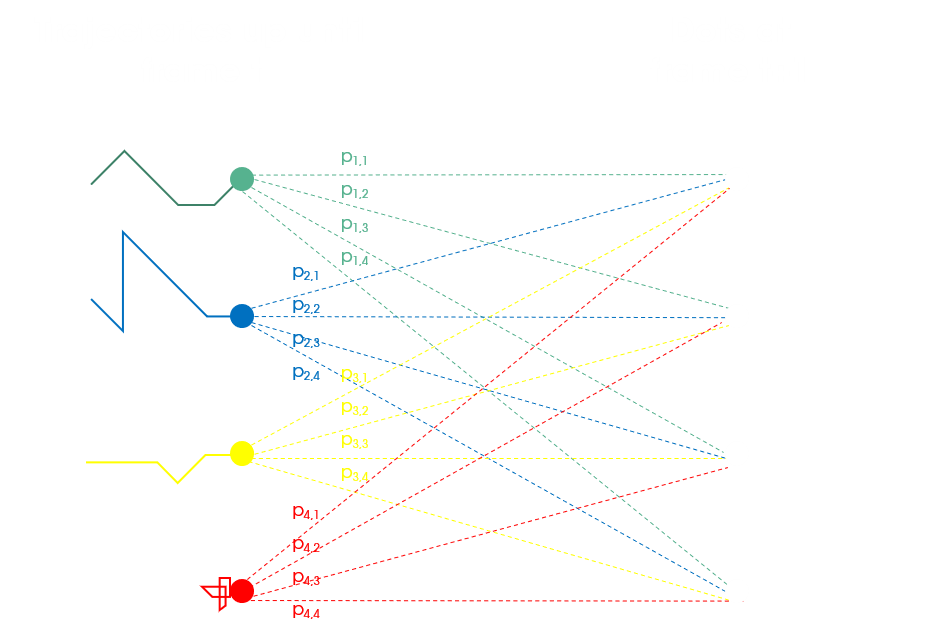 The goal of an SPT algorithm is to connect the dots from frame to frame. Typically, a standard SPT algorithm takes all tracks at frame t and all dots at frame t+1 and calculates the probability of assigning each track to each dot. This probability can be calculated based on several different parameters: proximity, motion speed, brightness… Afterwards, the algorithm chooses the solution that maximizes the overall probability.
