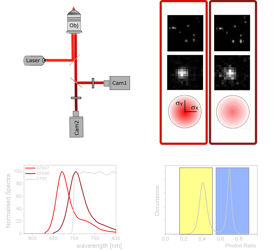 The emission light is splitted with a long pass dichroic into two separate pathways before reaching the two cameras; the number of photon is evaluated for each detection on both cameras; a photon ratio R is then calculated for each detection; the detection is then assigned to a particular color on the basis of the measured R and the a priori knowledge of the characteristic ratio for each fluorophore.