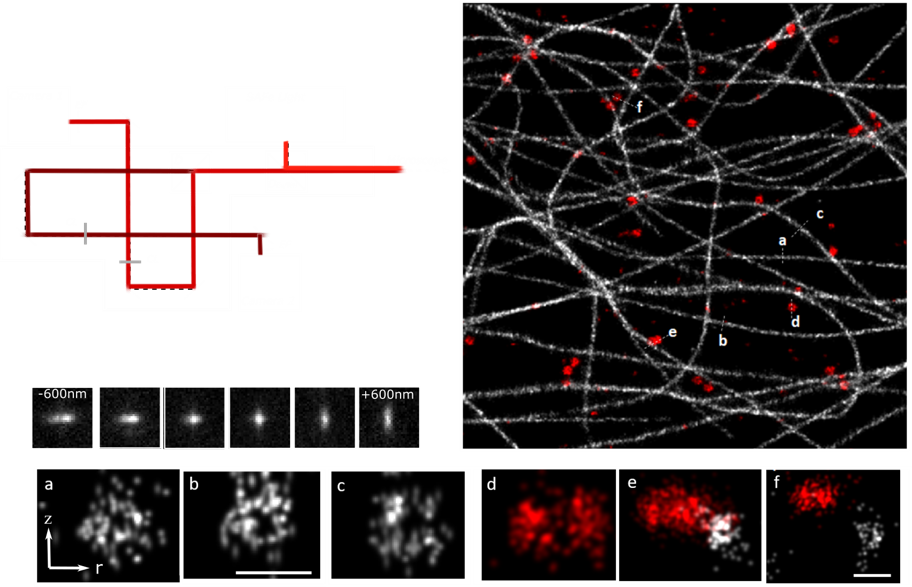 Multicolor three-dimensional nanoscopy is possible with the spectral demixing strategy here presented, allowing important insight into the relative organization of cellular structures. Abbelight strategy to obtain the axial information is to deform the PSF by introducing two cylindrical lenses in the optical path (fig.2). Via astigmatism the z information is encoded in the PSF deformation: by measuring the deformation the z position of the emitter from the focal plane can thus be retrieved.