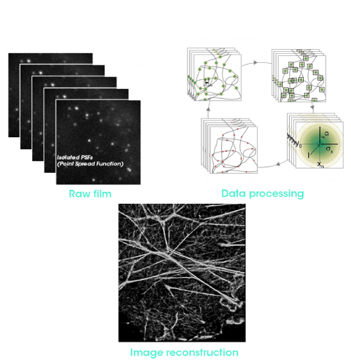 Data quantification and analysis are then performed to resolve either structures or dynamics at the nanoscale level. To reconstruct a nanoscopy image, each molecule is detected and localized by specialized algorithms.