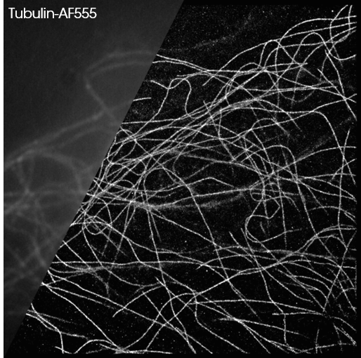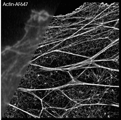 TIRF (Total internal reflection fluorescence) aims to excite with the critical angle the sample leading to complete reflection of the laser beam. When doing so, an evanescence wave is created and only excites molecules that are in the first hundreds of nanometers of the coverslip. This suppresses the background in depth. This approach is used to image structures close to the coverslip: membranes, cytoskeleton, in vitro surfaces…